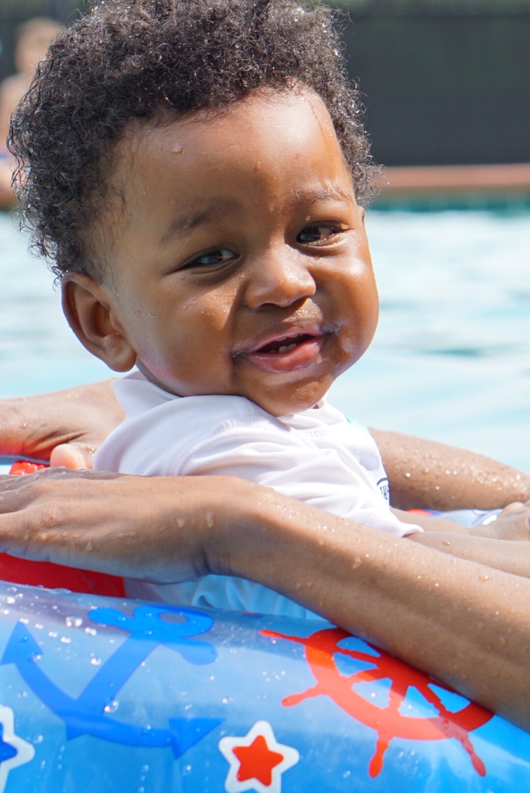 Avery, on the other hand, is fully equipped for summertime at the pool. He’s got a couple of swim trunks, baby sunglasses, a hat for shade that he immediately threw in the pool as soon as we got in, and his swim diapers. He’s good to go!