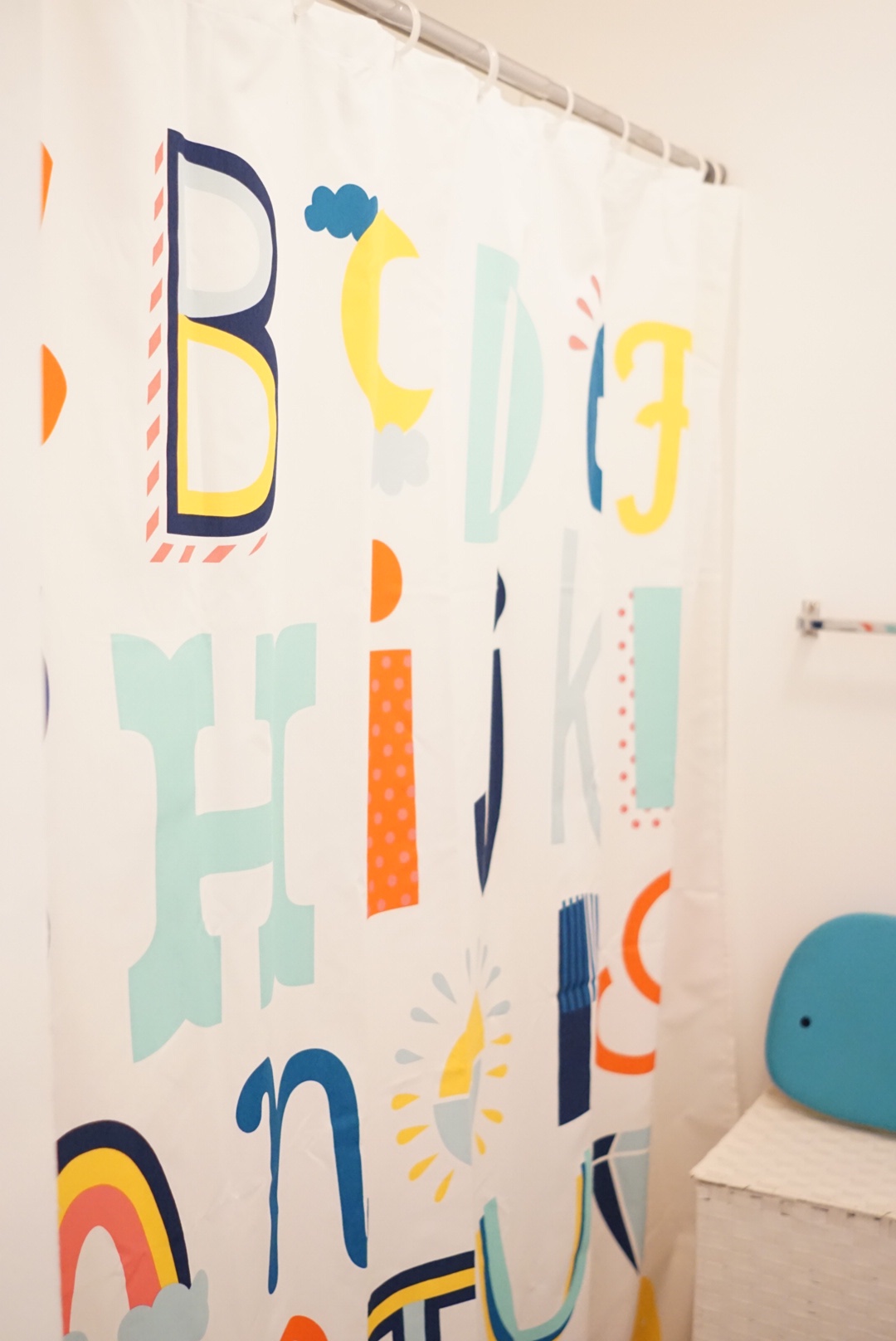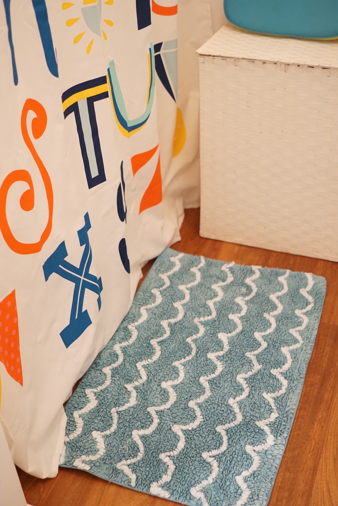 Then I found a shower curtain that tied everything together. It made the rugs make better sense and I knew it would compliment the shark stool.